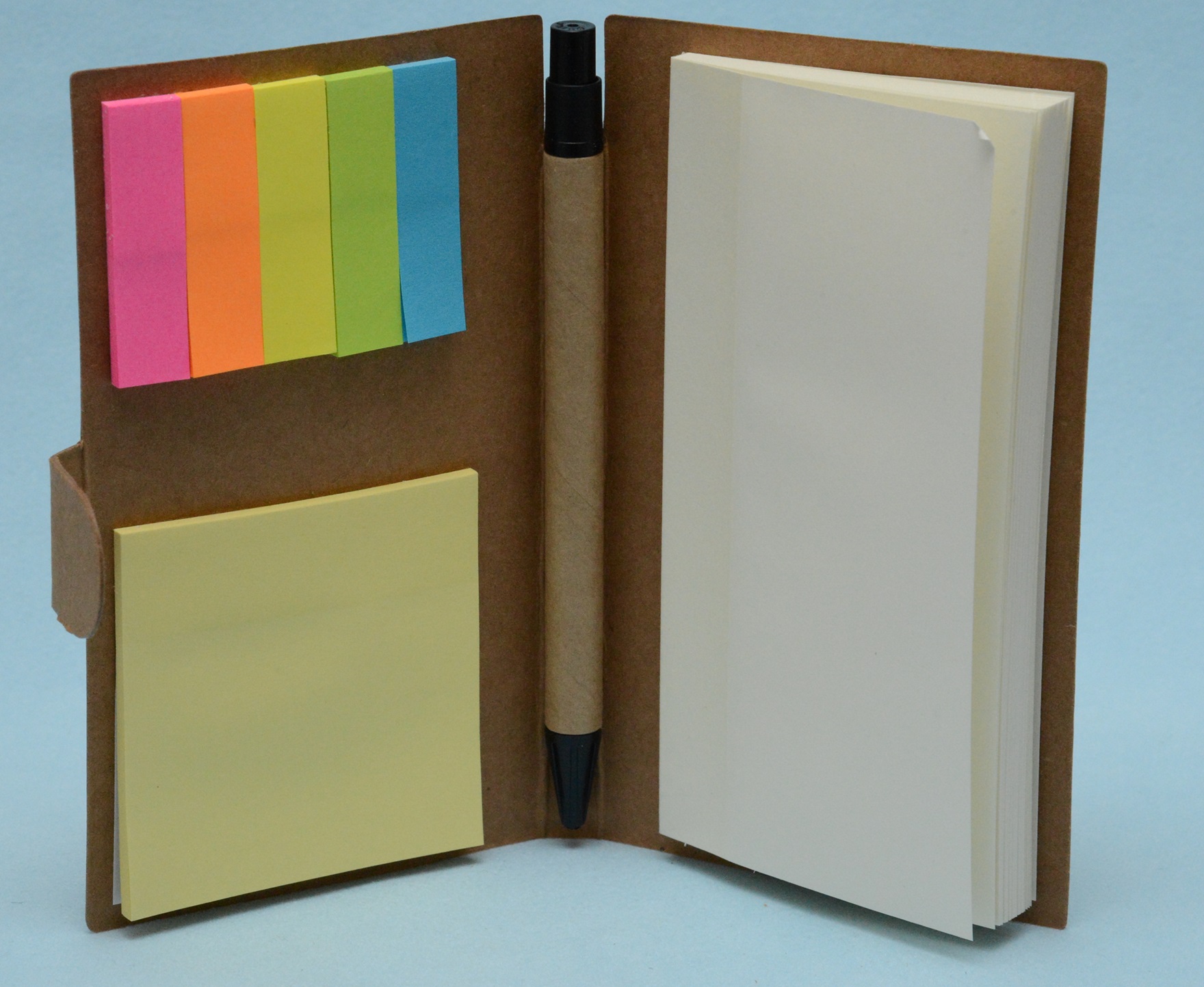 Kompakti ja ympäristöystävällinen muistilehtiösetti, joka sisältää muistivihkon, värilliset sivumerkit, muistilaput ja kynän.