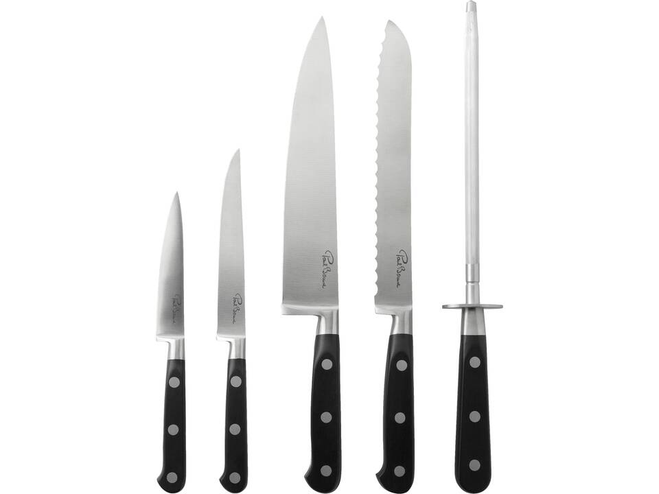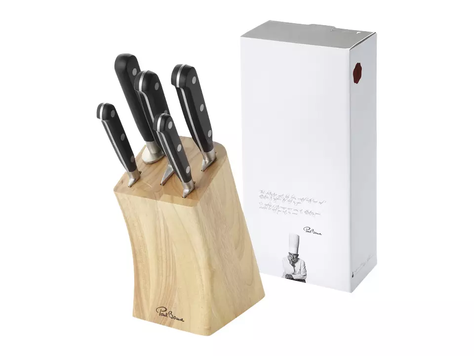 Tämä klassisen tyylinen veitsitukki sisältää viisi keittiön tärkeintä työkalua: 20 cm kokkiveitsen, 20 cm leipäveitsen, 13 cm yleisveitsen, 10 cm kuorimaveitsen sekä 20 cm teroituspuikon. Kokonaisuus toimitetaan tyylikkäässä, yksilöllisesti suunnitellussa Paul Bocuse -lahjapakkauksessa.
